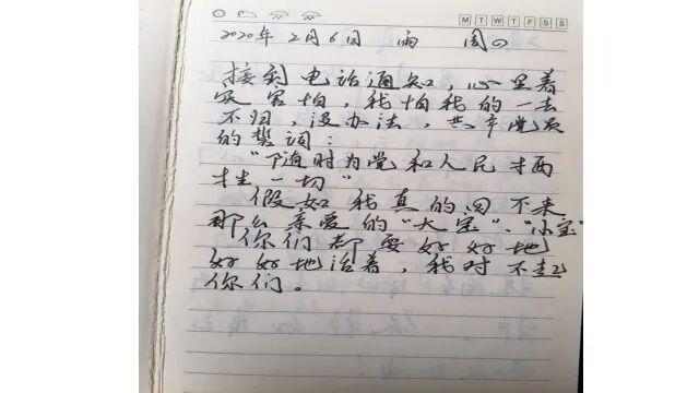 作为党员干部,爸爸在疫情最严重之时必须每天下沉社区,帮扶民生。上个月,爸爸偶然找到了他的工作笔记本,翻了翻,笑着递给我,对我说:“你看,我还写过一封遗书。”